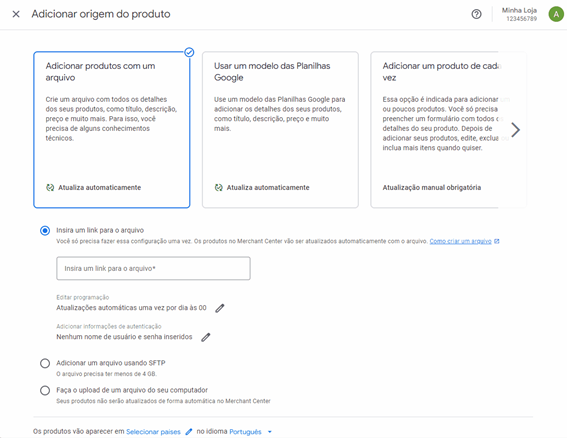 Em “Adicionar origem do produto”, mantenha selecionada a opção “Adicionar produtos com um arquivo”.