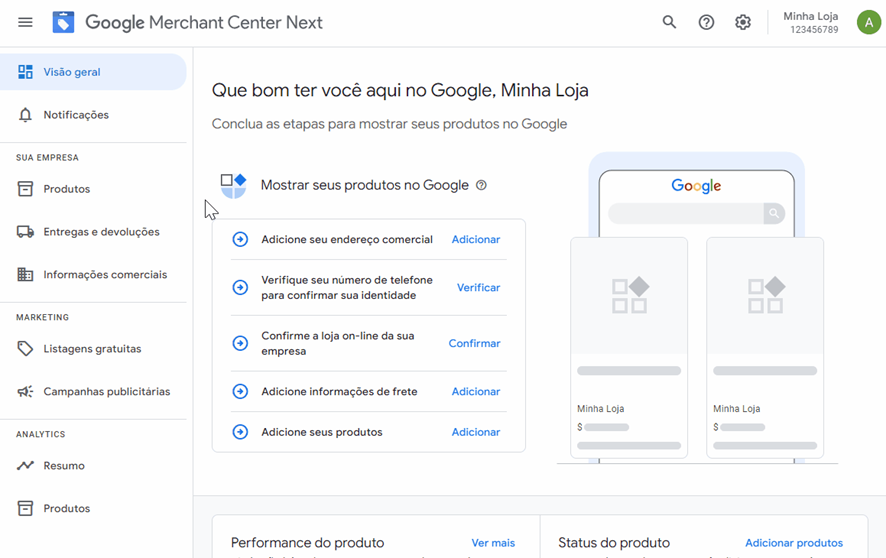 Passo 1 — Acesse sua conta no Merchant Center